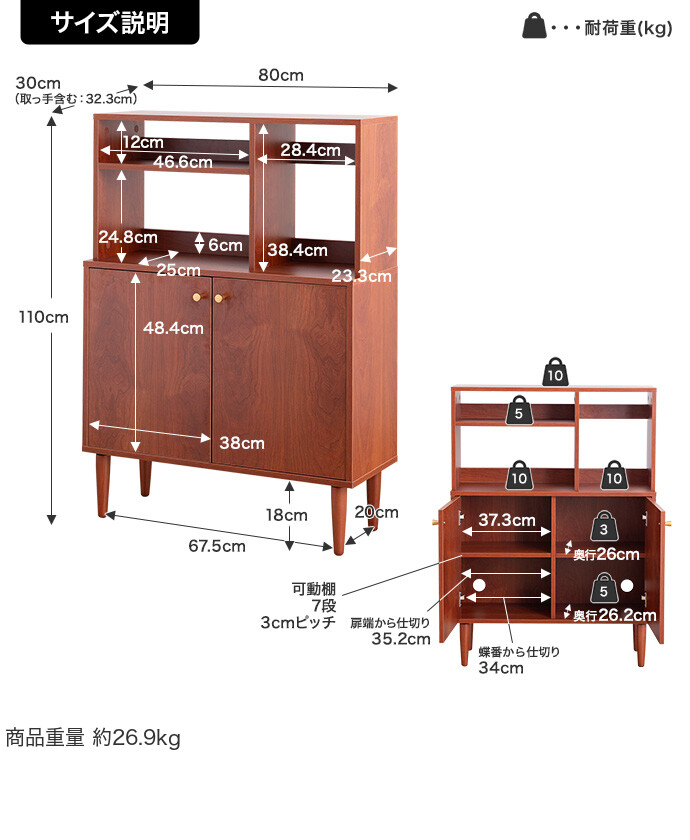 【耐荷重】天板:約10kg、オープン収納(棚):約5kg、オープン収納:約10kg、可動棚板:各約3kg、底板:各約5kg