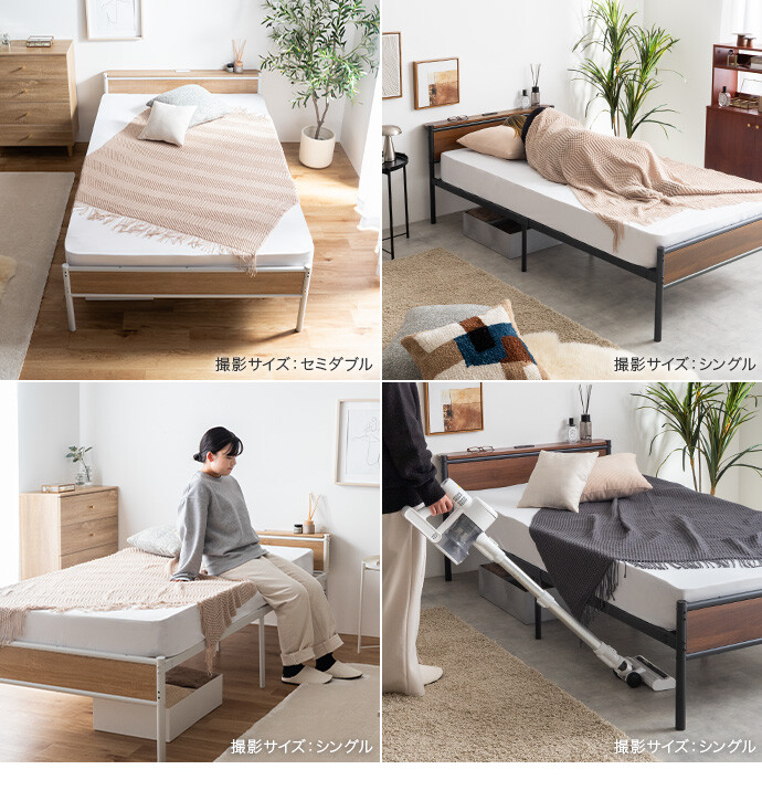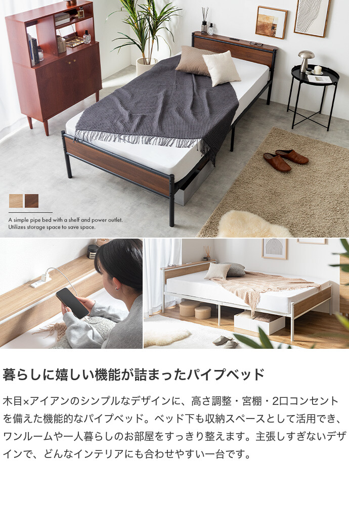 【フレームのみ 】シングルベッド パイプ ローベッド フレーム マットレス付き ヘッドボード 宮棚 コンセント ベッド下収納 コンパクト 小さい かわいい