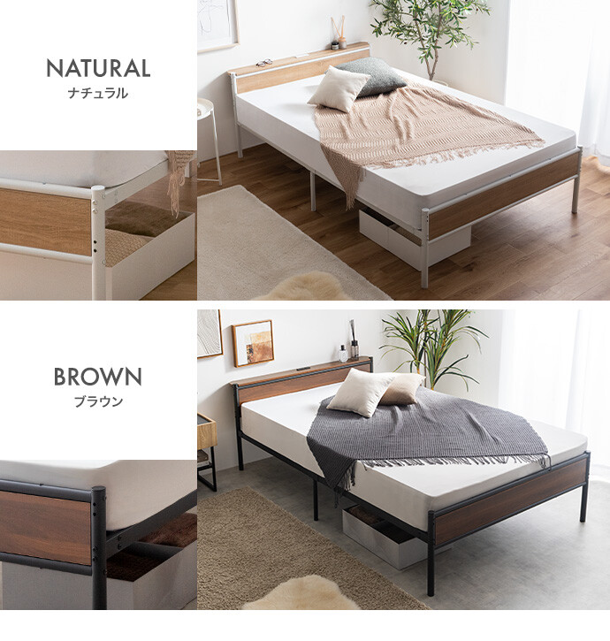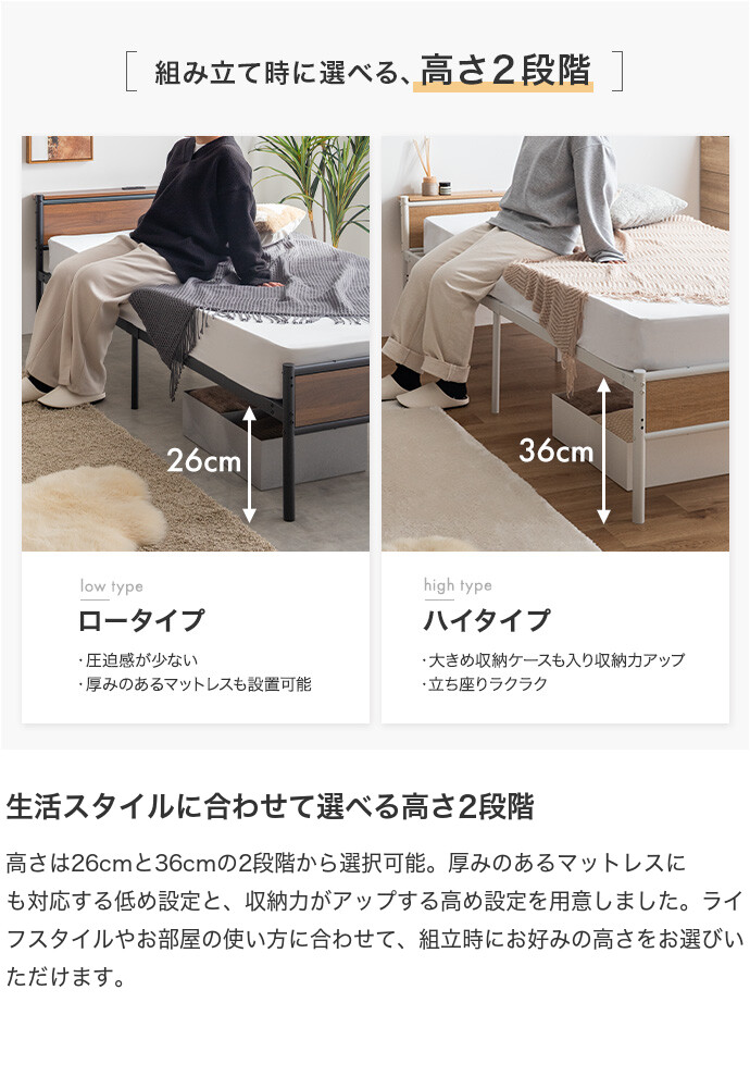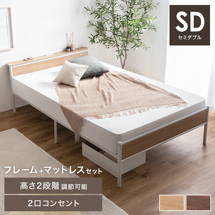 【ボンネルコイルマットレス付き 】セミダブルベッド パイプ ローベッド フレーム マットレス付き ヘッドボード 宮棚 コンセント ベッド下収納 コンパクト