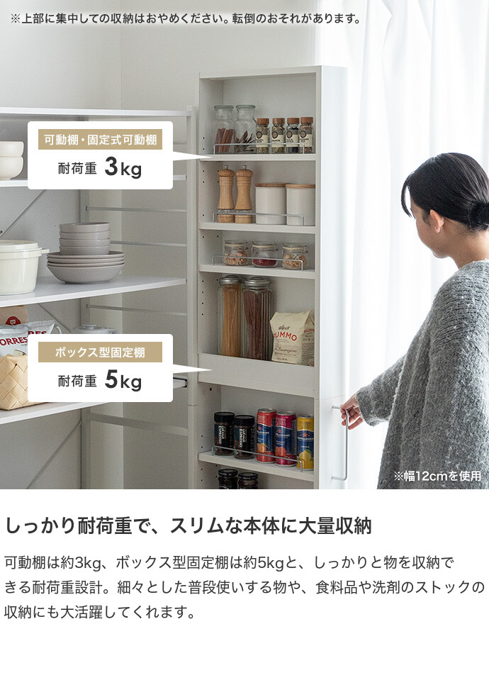 【耐荷重】天板:約5kg 、可動棚:(各)約3kg、固定式可動棚:(各)約3kg、ボックス型固定棚:(各)約5kg