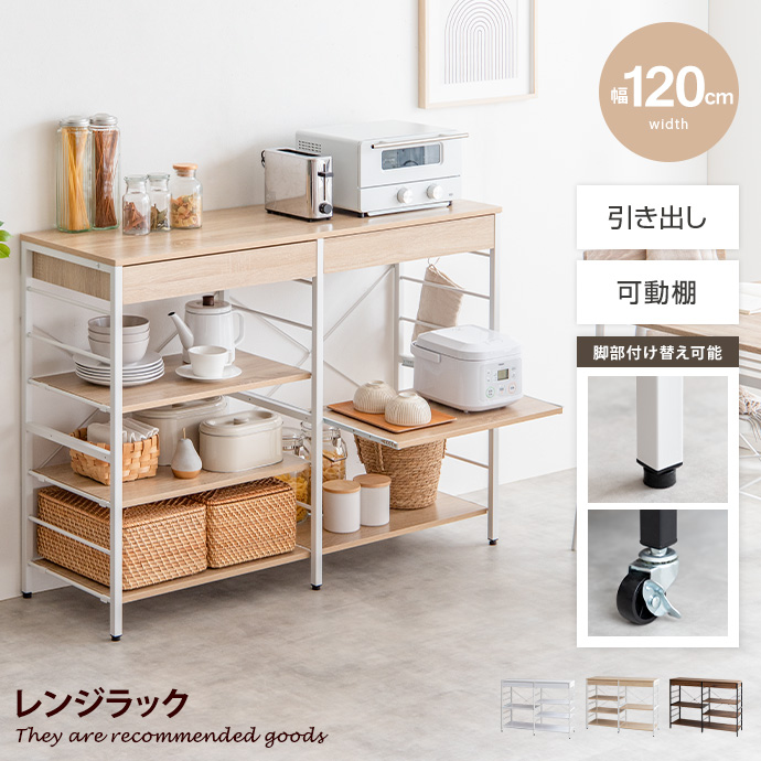 レンジラック レンジ台 キッチン収納 引き出し 可動棚 大容量 キャスター アジャスター 大型レンジ対応 幅120cm レンジボード 食器棚 キッチンラック