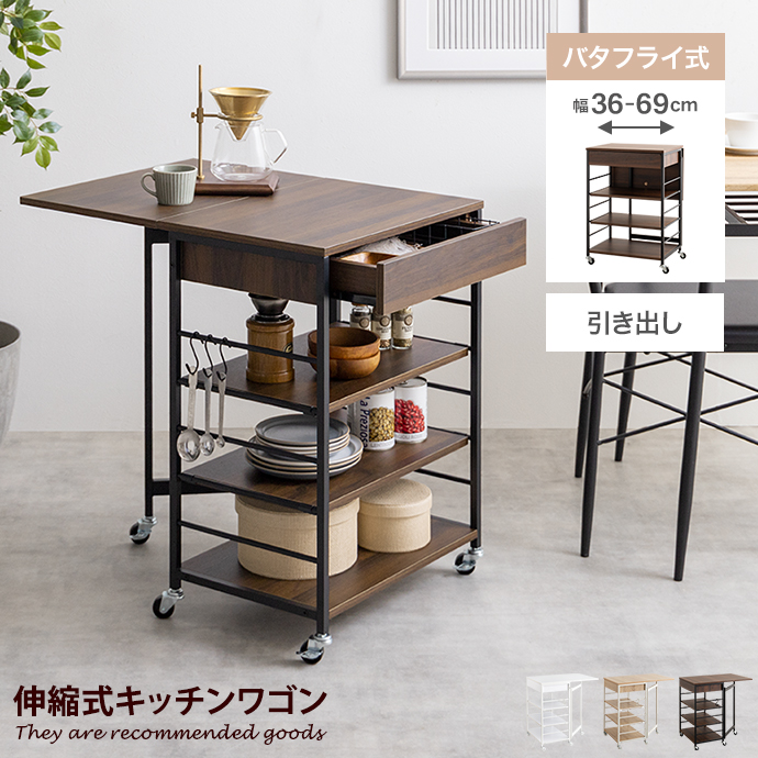 キッチンワゴン キッチンラック キャスター付き サイド テーブル ワゴン キッチン収納 引き出し 作業台 スリム 隙間 バタフライ天板 折りたたみ 伸縮 伸長