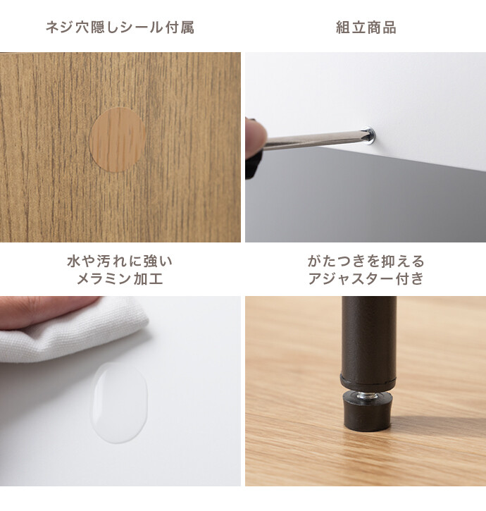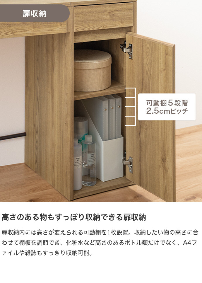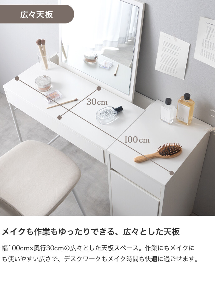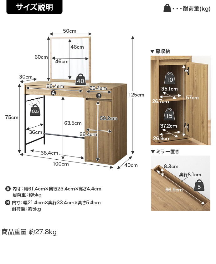 【耐荷重】天板:約40kg、引き出し:(各)約5kg、可動棚:約10kg、扉収納底板:約15kg、サイドバー:約0.5kg、ミラー置き場:約5kg