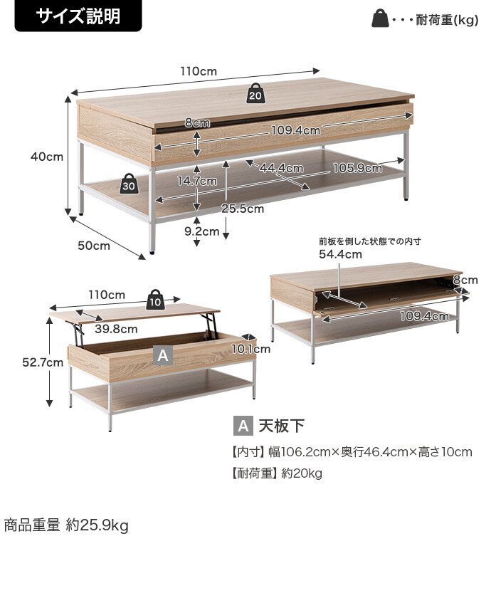 【耐荷重】天板:約20kg、天板(昇降時):約10kg、収納:約20kg、棚板:約30kg