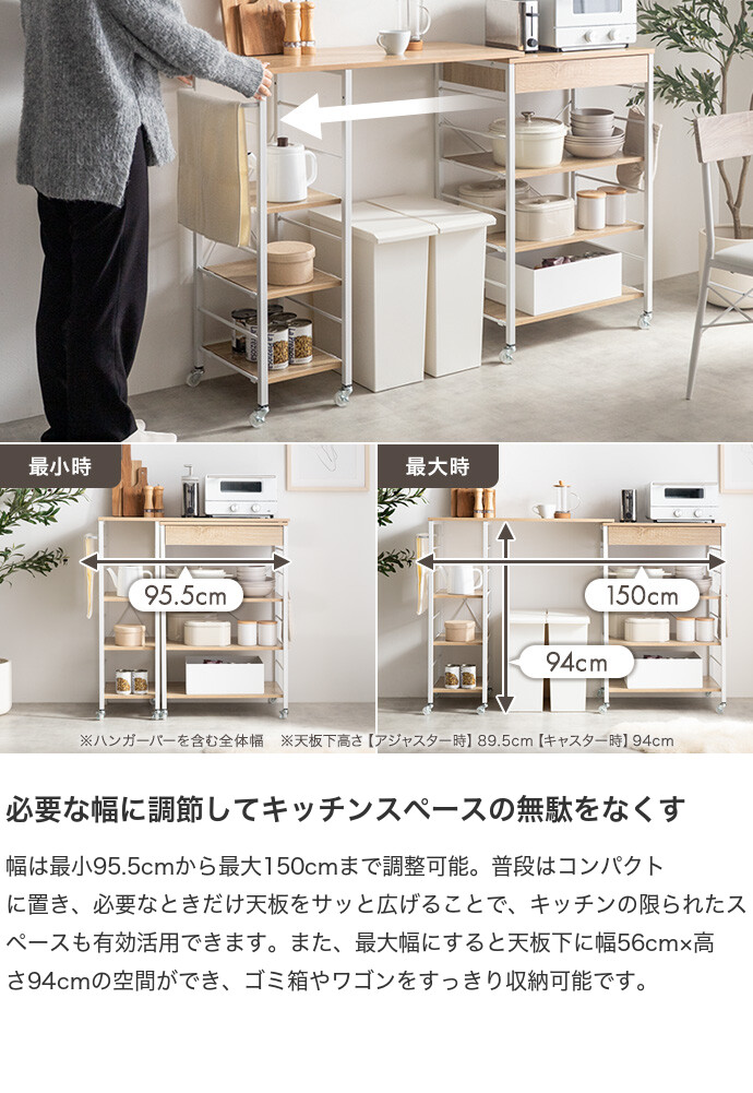 ■サイズ:幅95.5〜150cm×奥行40cm×高さ(キャスター装着時):95.5cm (アジャスター装着時):91cm