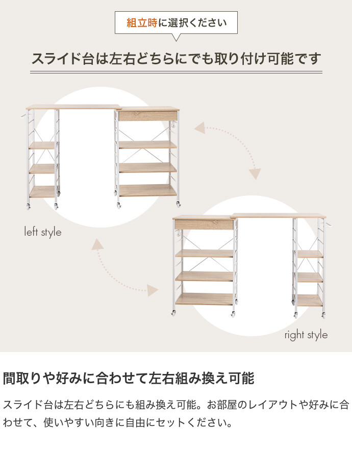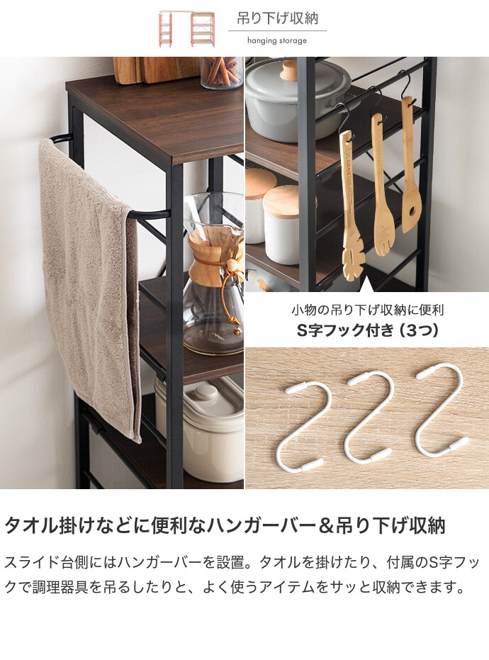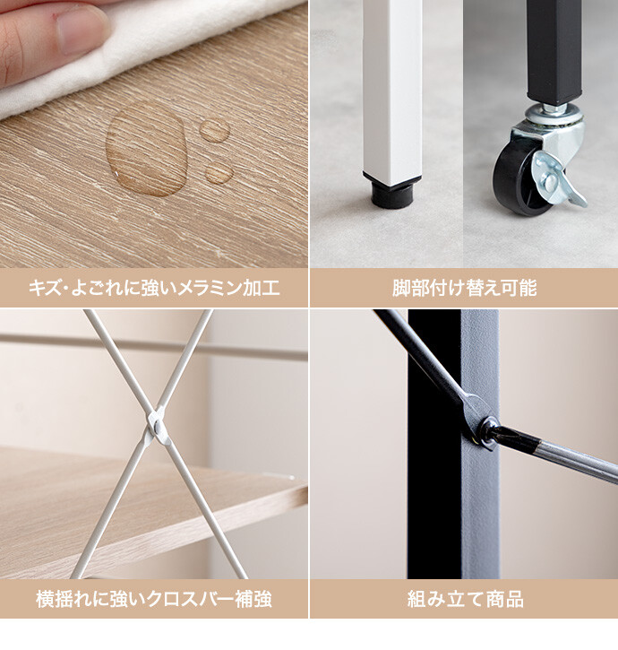 【耐荷重】天板(スライド台):約20kg、天板(引き出し上):約20kg、ハンガーバー:約2kg、可動棚(大小):各約10kg、引き出し:約5kg、S字フック:各約2kg