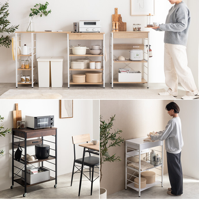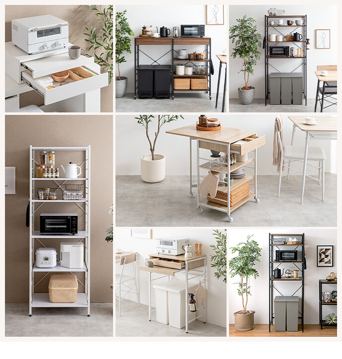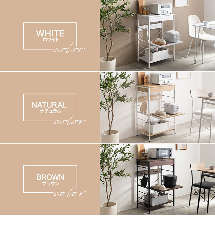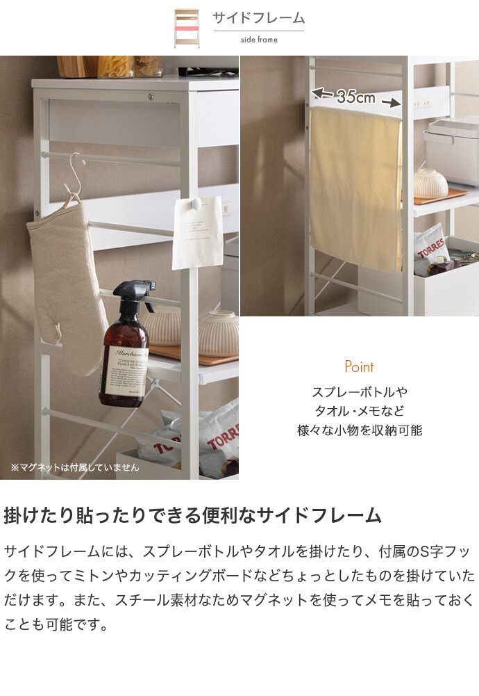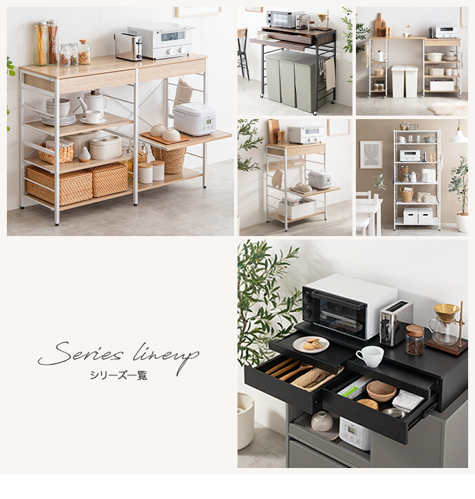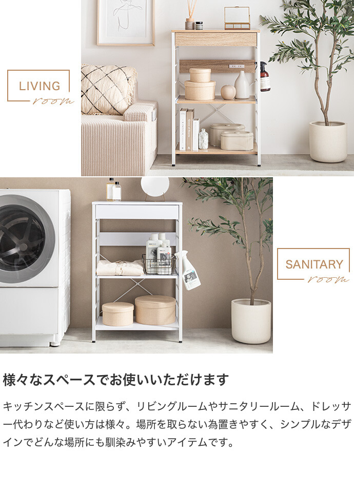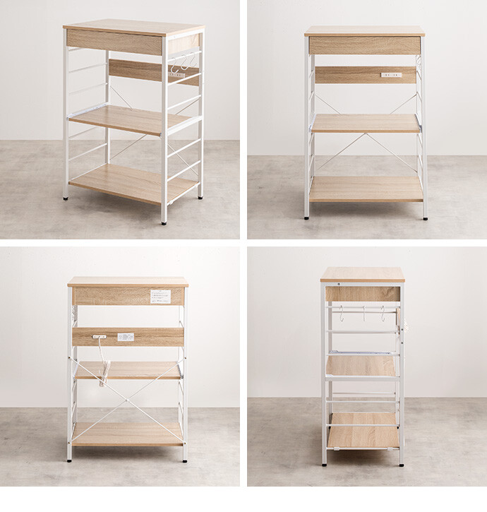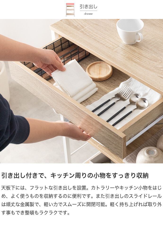 【耐荷重】天板:約15kg、スライドトレー:約10kg、可動棚:約5kg、引き出し:約5kg、S字フック:各約2kg