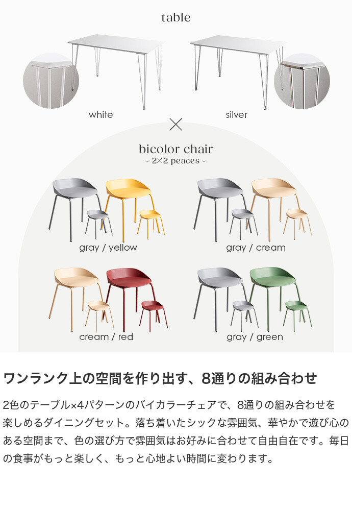 ■脚部:【テーブル】ホワイト:アイアン(粉体塗装)、シルバー:クローム(メッキ塗装)