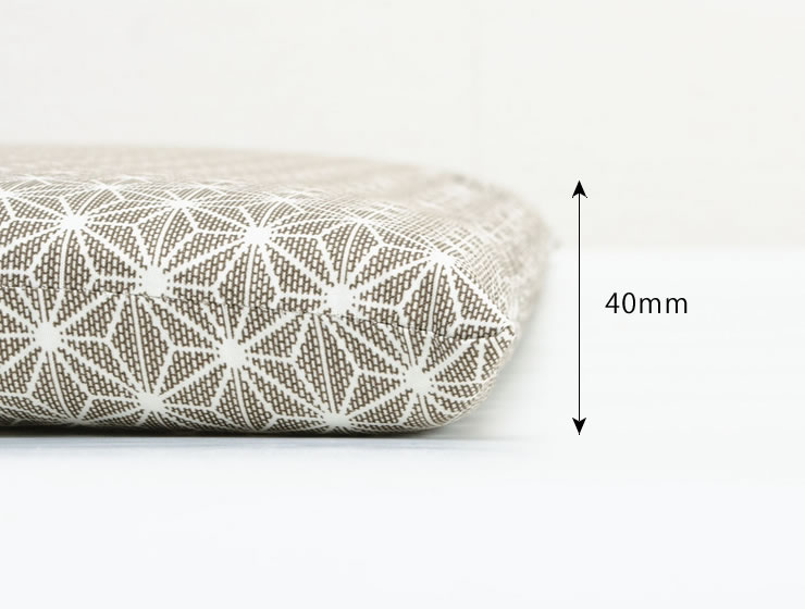 約40mmの固わたを使用しているため、しっかりとした座り心地です。固わたは、ポリエステル綿を固めた素材。通気性に優れ、長時間の使用でも蒸れにくいのが特長です。また、型崩れしにくく、長くお使いいただけます。