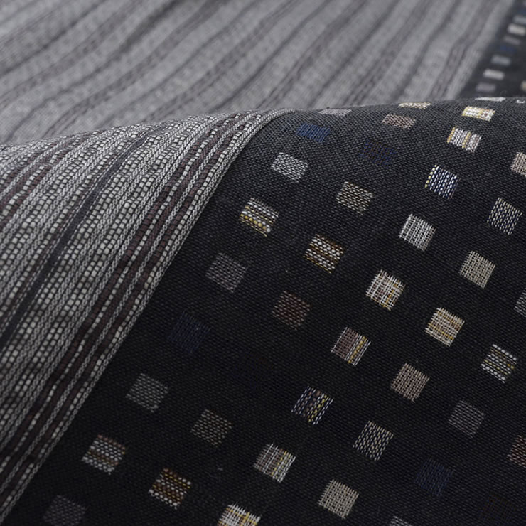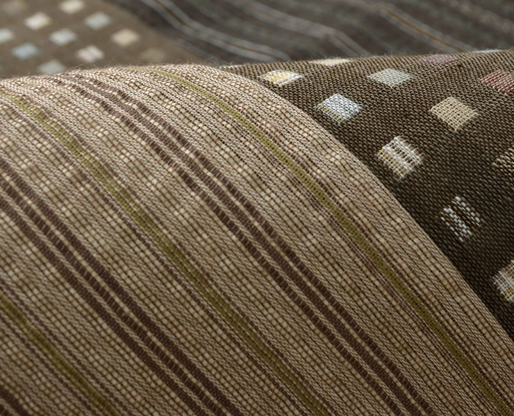 しじら織り縮織り(ちぢみおり)の一種。張った経糸と弛ませた経糸を交互に配置して平織にし、ゆるくした糸を縮ませて仕上げた織物で、布の表面が波状になります。肌への接地面積が少ないため、ベタつかず、風通しが良くシワになりにくいため夏の衣料品に多く用いられます。
