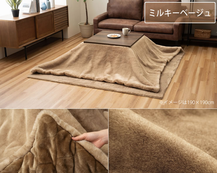 表地は極上の手触りのフェイクファー生地、裏地はなめらかなフランネル生地。ボリュームがあり、触れた時にふんわりあたたかいこたつ布団です。