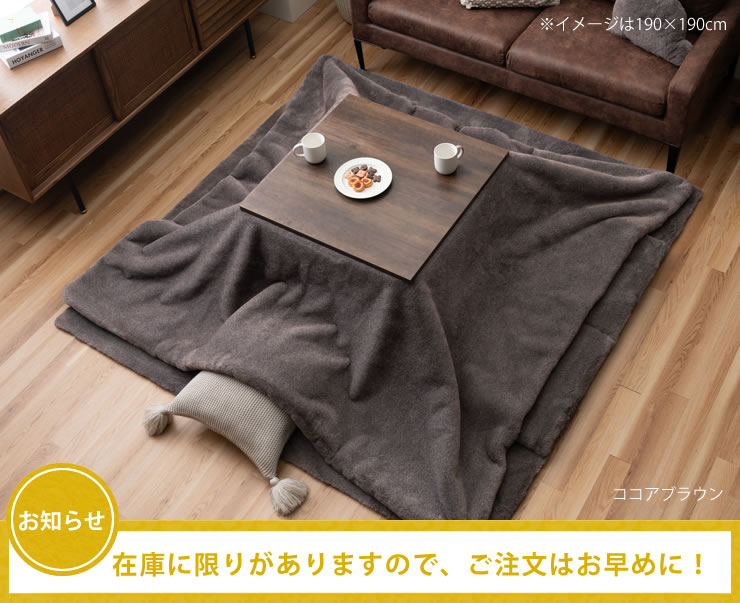 季節商品である「こたつ」 「こたつ布団」は、製造メーカーの在庫限りで追加生産のない商品が一般的に多く、人気商品は早期に完売する可能性がありますので、お早めのご注文をおすすめいたします。