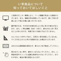 | 材質 | 国産い草100% 袋織り(三重織り) 縁:綿100% 中材:パーム(ヤシの実繊維)、木質繊維ボード 裏面:不織布ポリエステル100%、アクリル樹脂100% 滑り止め加工 |