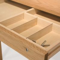 A4サイズのファイルも入る鍵付き引き出しが付いています。右側は仕切り板つきで小物の整理に役立ちます。