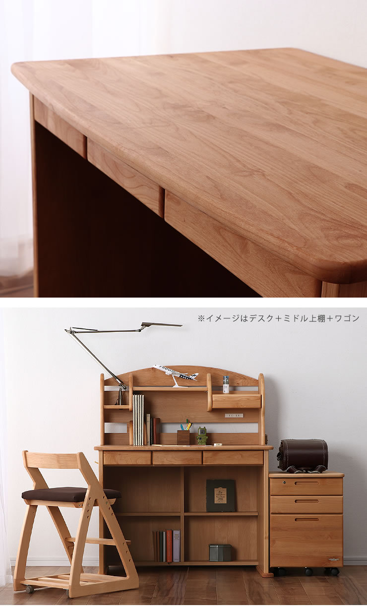天然木のぬくもりを感じられるナチュラル感と、国産ならではの丁寧な作りが魅力の、丸みのあるアルダー材のデスクです。小さなお子さまにも使いやすく設計。3杯の引き出しや足元収納など収納力も豊富で、学校で道具など身の回りのものをすっきりお片付け出来ます。