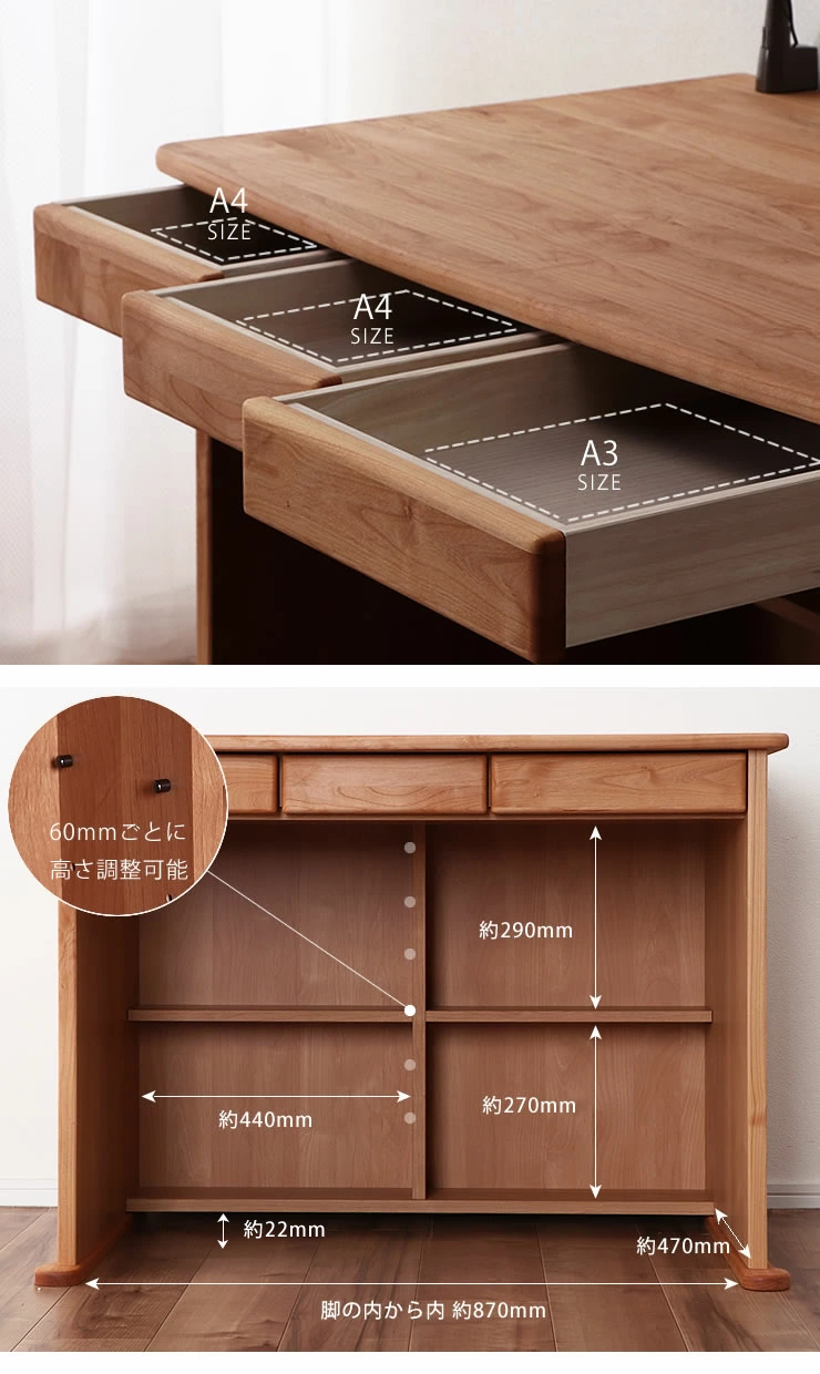 デスク引き出しは3杯付いており、左側と真ん中の引き出しはA4、右側はA3サイズのものがすっぽり収まります。