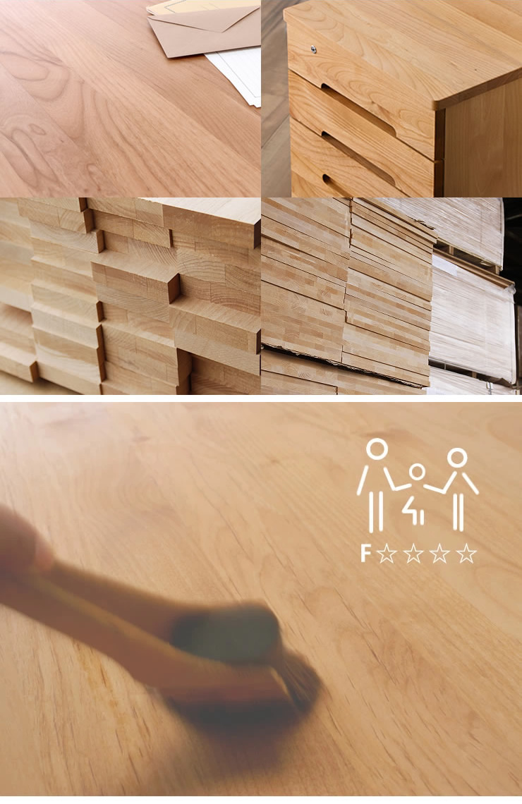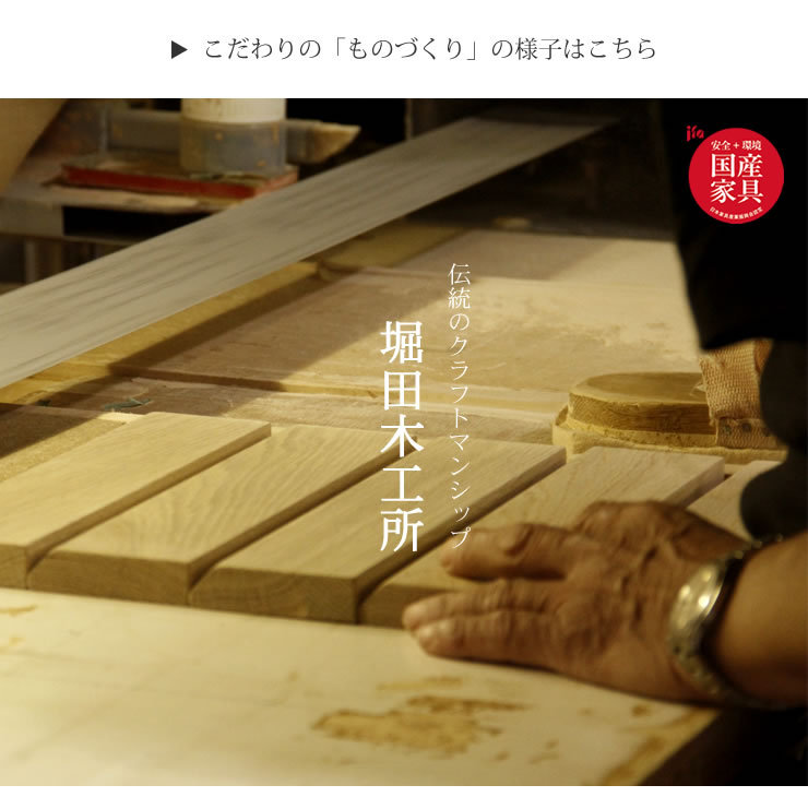 こちらのシリーズを作製している堀田木工所は広島県の老舗家具メーカー。商品はすべて国内生産。木取り・加工・塗装・組み立てをすべて国内工場でおこない、職人さんの手で一つひとつ丁寧につくられています。国内製造かつ安全や環境面での基準をクリアした事業者・製品にのみ表示できる「国産認定家具」に該当する商品です。