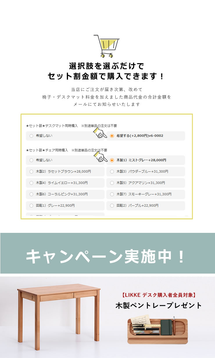 広島にある学習机メーカーさんと開発した、当店オリジナルの学習机「LIKKE(リッケ)」。「リッケ」とはノルウェー語で "幸せ・幸福"を意味する言葉です。新たにお勉強の世界へ足を踏み入れ、成長をされるお子さまへ、幸せな時間がたくさん過ごせるようにと願いを込め作りました。