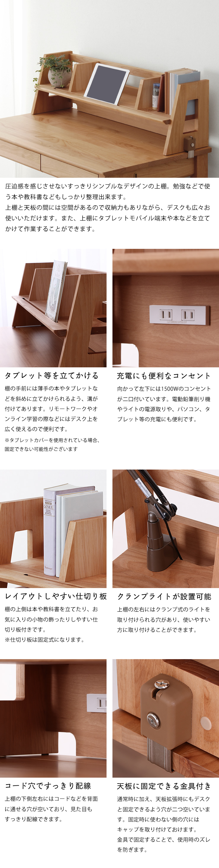 シンプルで圧迫感のないデザインが魅力の学習机用上棚。タブレットや本を立てかけられる溝付き棚、2口コンセント、クランプライト対応など機能性も充実しています。レイアウトしやすい仕切り板とすっきり配線できるコード穴付きで、学習環境を快適に整えます。アルダー無垢材を使用した安心品質のデスク上棚です。