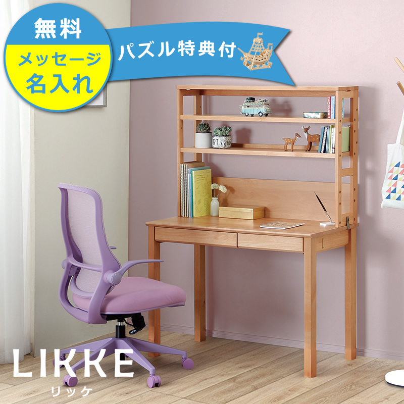LIKKEデスクシリーズは、インテリアになじむ上質なデザインと国産の確かなつくりで、お子さまの成長はもちろん、大人の書斎机としても長く愛用いただける当店おすすめ商品です。用途やお部屋の広さに合わせて選べるシリーズ展開で、ご家庭それぞれの学習シーンに最適な組み合わせをお選びいただけます。