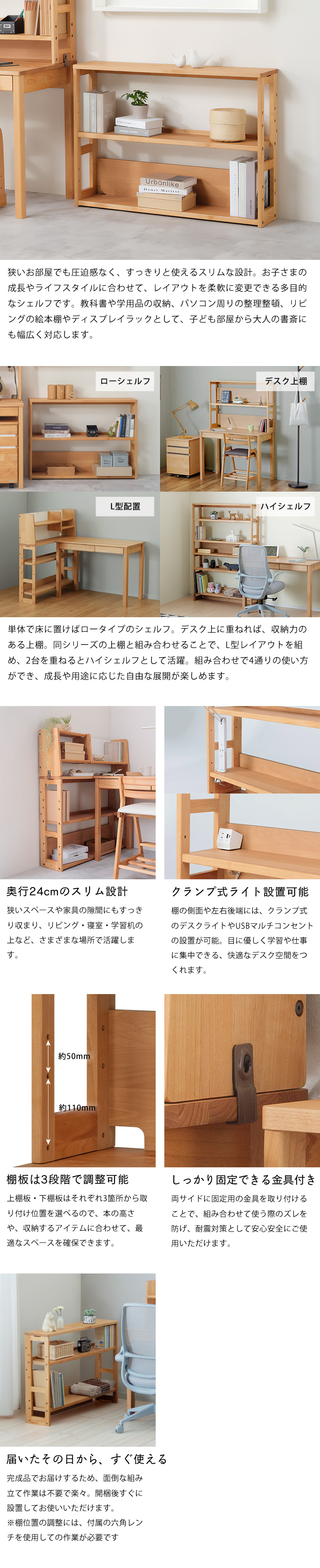 学習机用の上棚としても使えるマルチシェルフは、スリム設計で圧迫感なく設置できます。教科書や学用品の整理はもちろん、リビング学習や書斎収納にも対応。可動棚付きでレイアウト変更も自由自在な収納棚です。