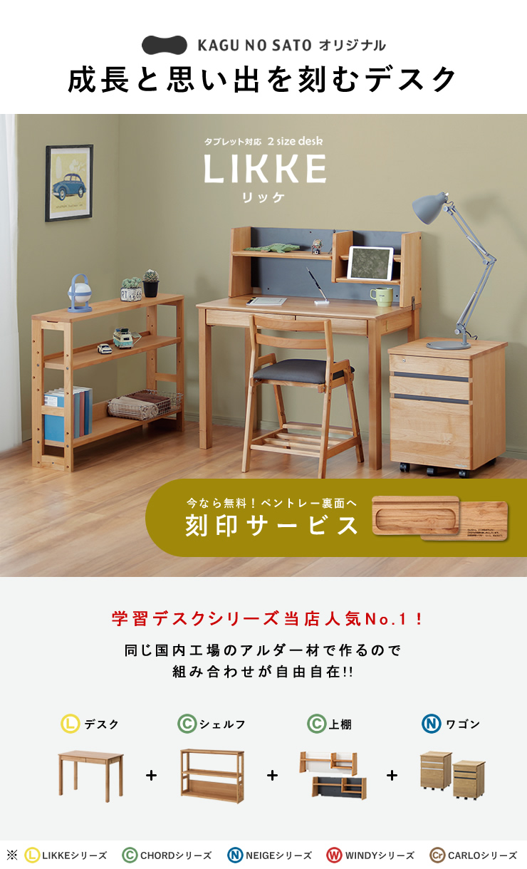 LIKKEデスクシリーズは、インテリアになじむ上質なデザインと国産の確かなつくりで、お子さまの成長はもちろん、大人の書斎机としても長く愛用いただける当店おすすめ商品です。豊富なシリーズ展開で、ご家庭それぞれの学習シーンに最適な組み合わせをお選びいただけます。