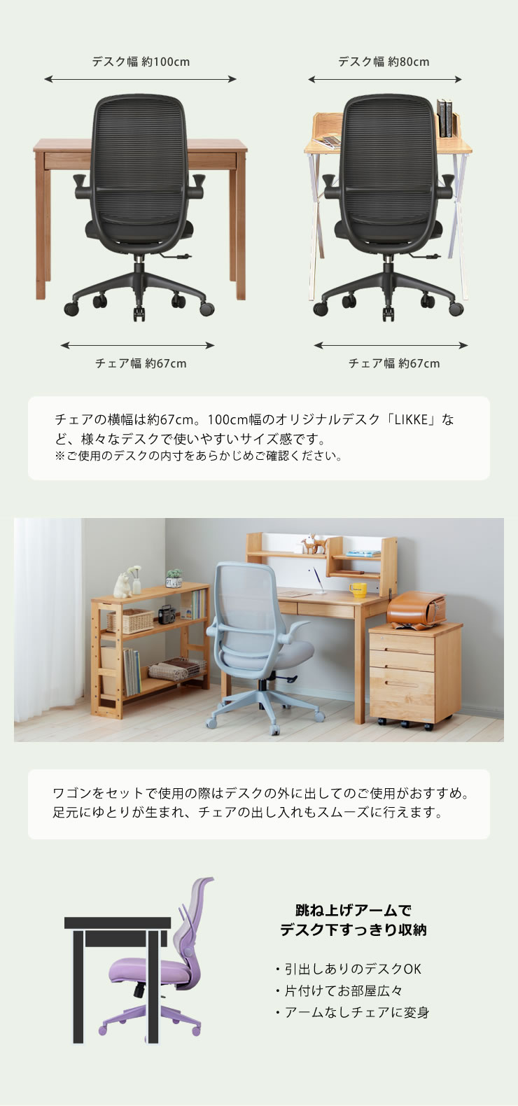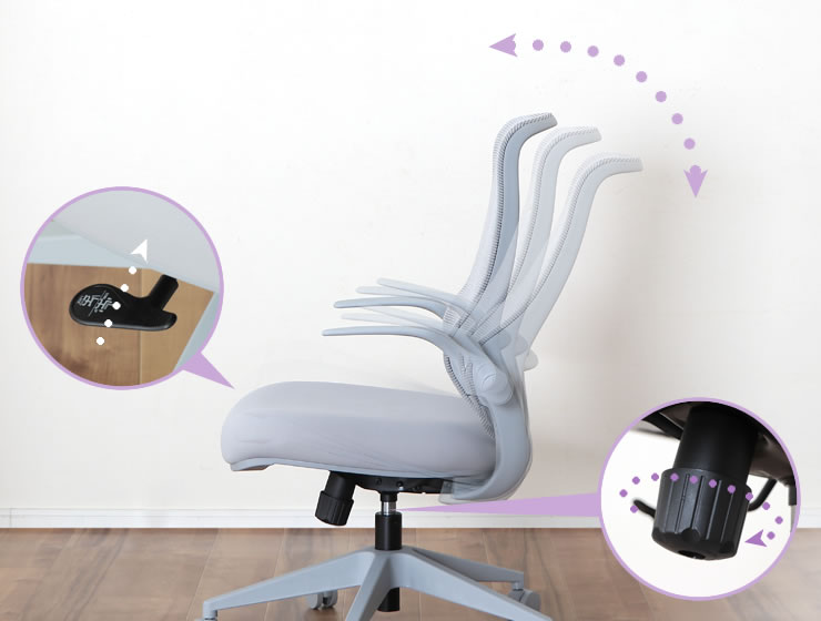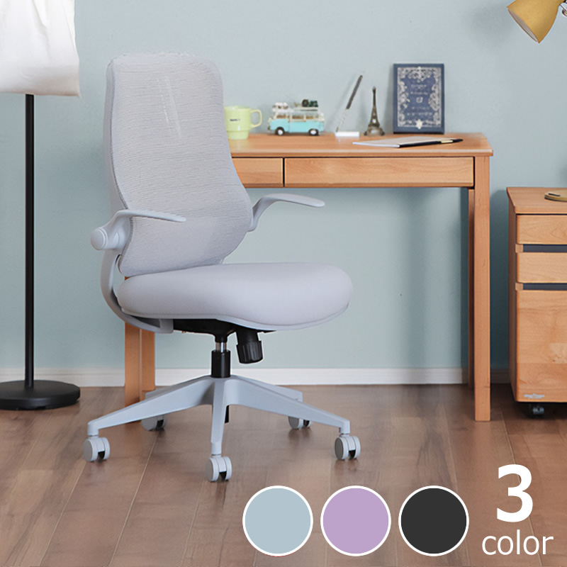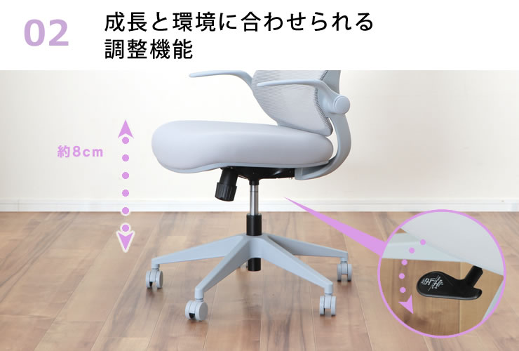 学習時や作業時に肘を支え、体の負担を和らげてくれるアームレスト。上に跳ね上げることができるので、チェアを使わないときは、引き出し付きの学習机でもチェアをデスク下にすっきり収納できます。また跳ね上げたまま使えば、座りながら自由な姿勢を取ることも。