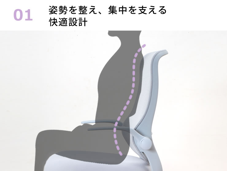 体にフィットする背もたれが成長期のお子さまや、デスクワークをする大人を体を優しく支え、長時間の学習・作業でも姿勢が崩れにくい設計になっています。