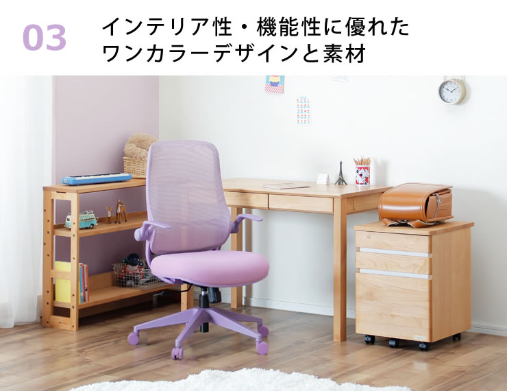 背もたれに座面、キャスターに至るまでワンカラーで仕上げられたデスクチェア。毎日が楽しくなるような、こだわりのカラーリングによる統一感あるデザインは、インテリア性が高くお部屋にすっと馴染みます。 学習机にあわせるチェアとして、またお自宅でのワークスペース用におすすめです。