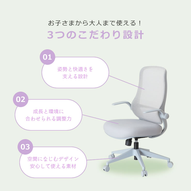 姿勢を支える設計、成長やデスクに合わせられる調整力を備えており、お子さまの学習チェアとして、また自宅のインテリアに馴染みやすいチェアをお探しの方におすすめの長く使える一脚です。