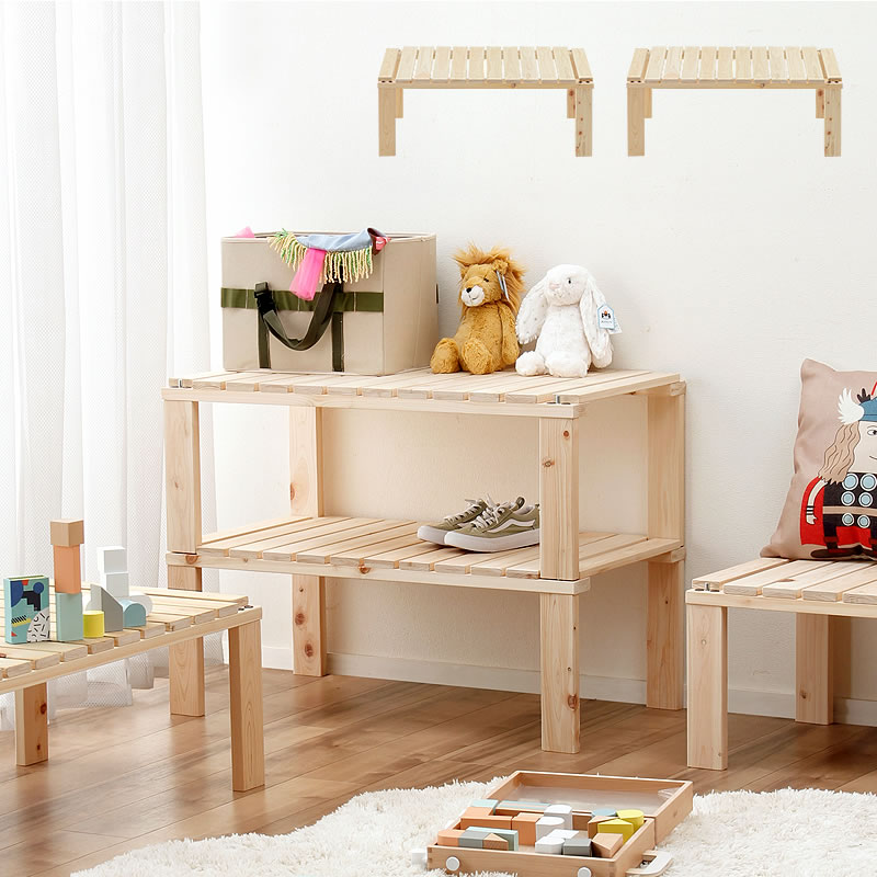 使い方は無限大。お子様の生活スタイルに合わせ簡単組み換え。シーンに合わせてマルチに変化する設計を実現。子供部屋やリビングで腰かけるベンチとして、積み木を置いたりおままごとをするキッズ用テーブルとして1段利用。2段に重ねると、奥行たっぷりのシェルフへ展開。おもちゃ箱や通園グッズの収納としても大活躍。すっきり脚設計でお掃除ロボットも床下にスイスイ入れるデザインです。