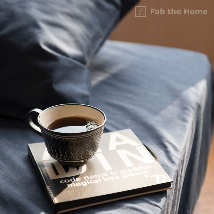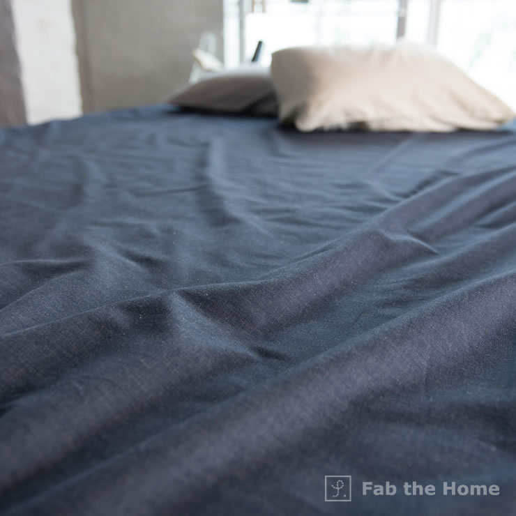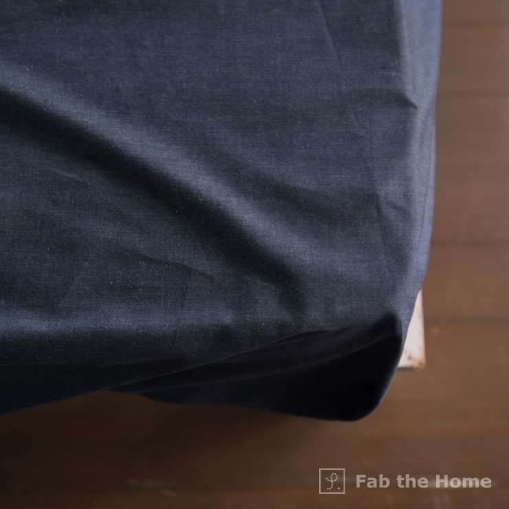 タテ糸に色糸、ヨコ糸に白糸を使ったファブリックをデニムと呼びます。ジーンズに使われるハードなデニムよりも細め(30番)の糸を使いソフトな肌ざわりに仕上げた、ベッドリネンに適したデニムです。