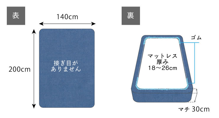 マットレスの厚み+底に敷き込む部分をマチと言います。マチを30cm取っていますので、少し厚めのマットレス(18〜26cm程度)でもすっぽり包んでくれます