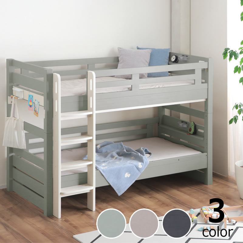 木の温もりが感じられるパイン無垢を使用したおしゃれなスモーキーカラーの二段ベッド。特許取得の耐荷重構造を採用することで、静止耐荷重500kg以上の高水準の耐荷重を実現し、地震にも強い仕様になっています。