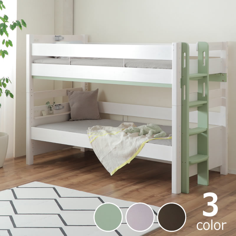 お部屋を明るく広く見せてくれ、清楚感があるホワイトカラーの二段ベッド。ホワイト部分は木目がうすく透けて見える塗装で、木のあたたかみを感じられます。またはしごや桟にはお部屋に馴染むアクセントカラーが入り、おしゃれなツートンカラーを楽しめます。