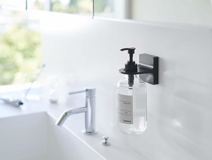 お手持ちのディスペンサーボトルをホルダーに取り付けてお使いください。ホルダー穴をボトルとボトルキャップではさむだけの簡単取り付けです。