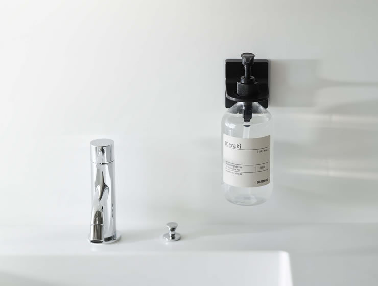ボトルを浮かせて設置できるフィルムフックホルダー。毎日使う食器用洗剤やハンドソープ、シャンプーやボディソープなどを使いやすい場所に設置できます。フィルムフックが付く壁面に取り付けてお使いください。