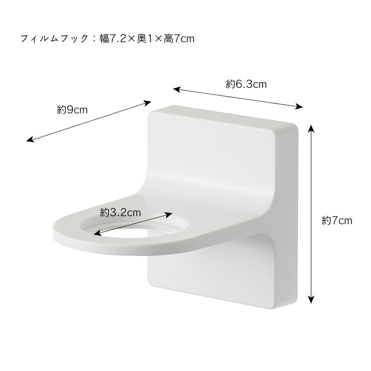 浴室のタイル面や洗面壁面などの平らな面に貼ったフィルムフックへホルダーを引っ掛けるだけで設置していただけます。フィルムフックははがして繰り返し使えるので設置場所の変更も簡単にできます。