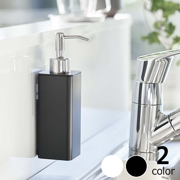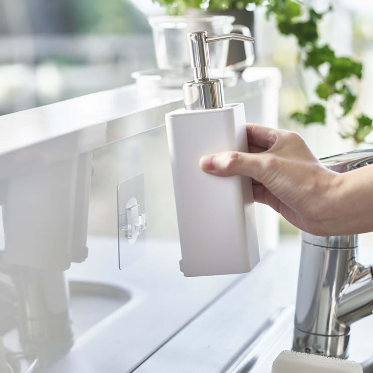 浮かせて設置できるフィルムフック付きボトル。毎日使う食器用洗剤やハンドソープなどを使いやすい場所に設置できます。洗面台でのご使用も便利です。フィルムフックが付く壁面に取り付けてお使いください。