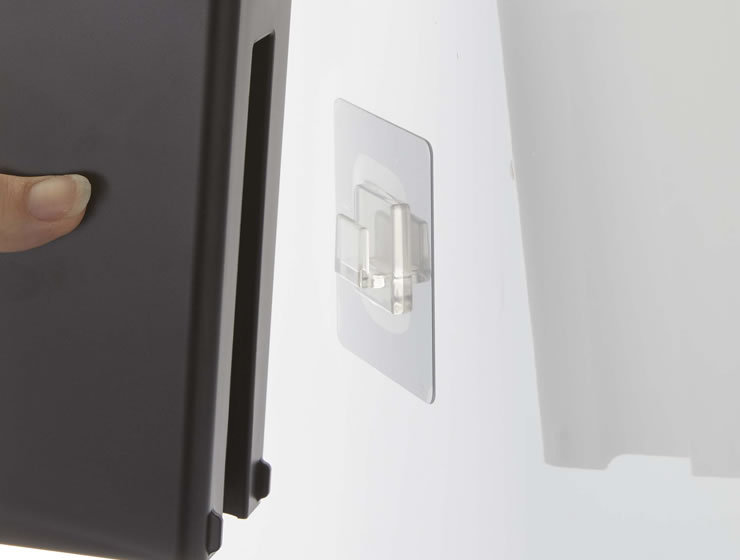 キッチンのタイル面や洗面壁面などの平らな面に貼ったフィルムフックへホルダーを引っ掛けるだけで設置していただけます。フィルムフックははがして繰り返し使えるので設置場所の変更も簡単にできます。