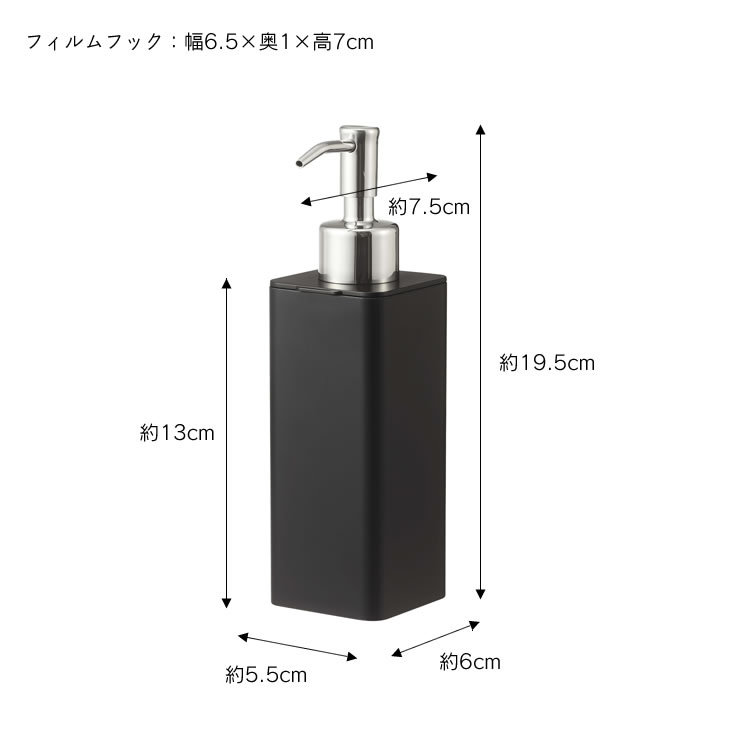 | 材質 | ディスペンサー(容器・蓋:ABS樹脂、パッキン:シリコーン、ポンプ:ステンレス、パイプ:ポリエチレン) フィルムフック(フィルム表面・フック部分:ポリカーボネート、フィルム中面:PET、フィルム接着面:シリコーン) |