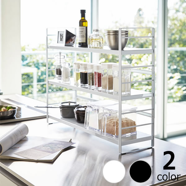 コンロ奥や横の隙間や、シンク上のデットスペースを活用できるキッチンシェルフ。コンロ脇のスペースにもぴったり。調味料、スパイス類、キッチン道具、小物を一括収納できます。