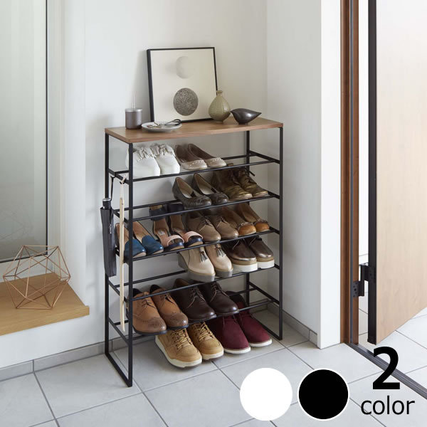 男性物なら約18足、女性物なら約21足収納可能なシューズラック。天板がついているので、鍵などの小物などの雑貨を置くだけでなく、付属のフックを利用して、靴べらや折り畳み傘なども引っ掛けて収納していただけます。