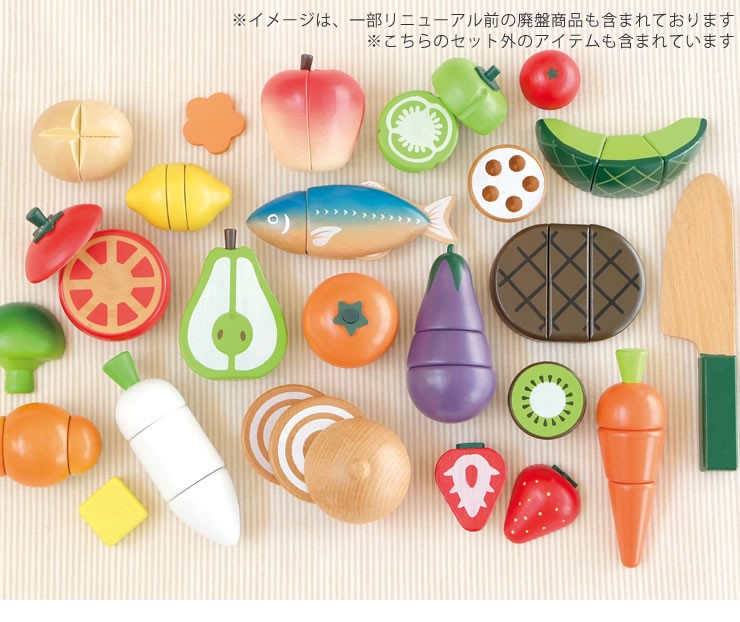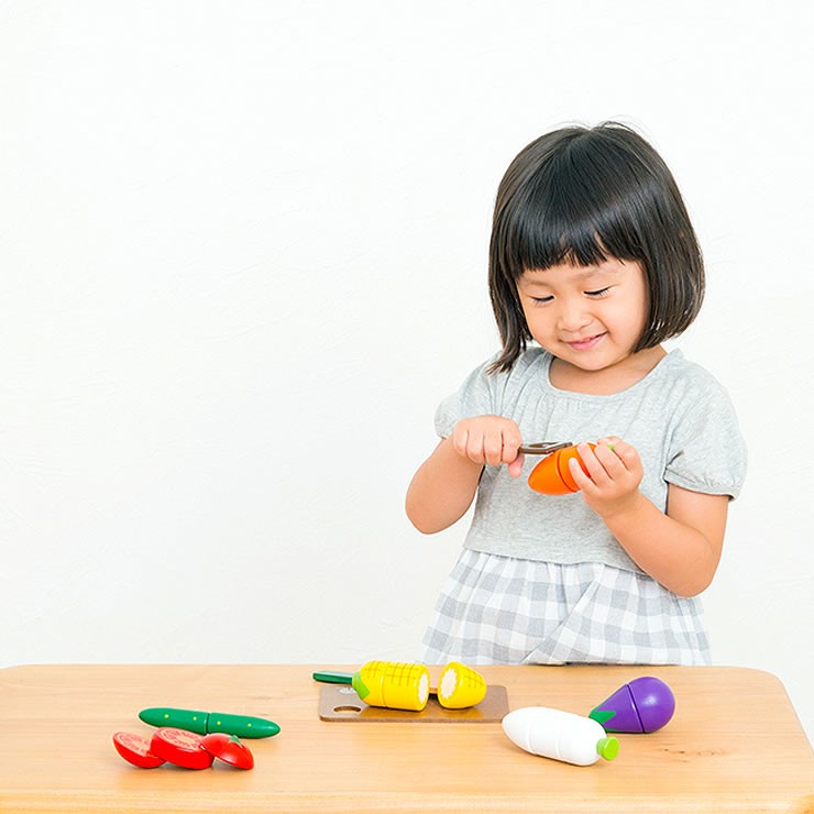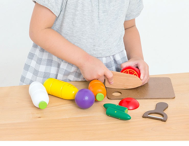 お母さんの真似をしたいお年頃のお子さまに喜んでいただけるおままごとセット。 包丁で切ったり、ピーラーで皮をむく真似ができたり、野菜を並べてお店屋さんごっこなど楽しく遊べます。