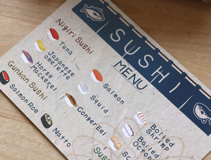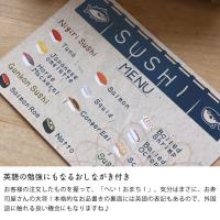 お客様の注文したものを握って、「へい!おまち!」。気分はまさに、お寿司屋さんの大将!本格的なお品書きの裏面には英語の表記もあるので、外国語に触れる良い機会にもなりますね♪