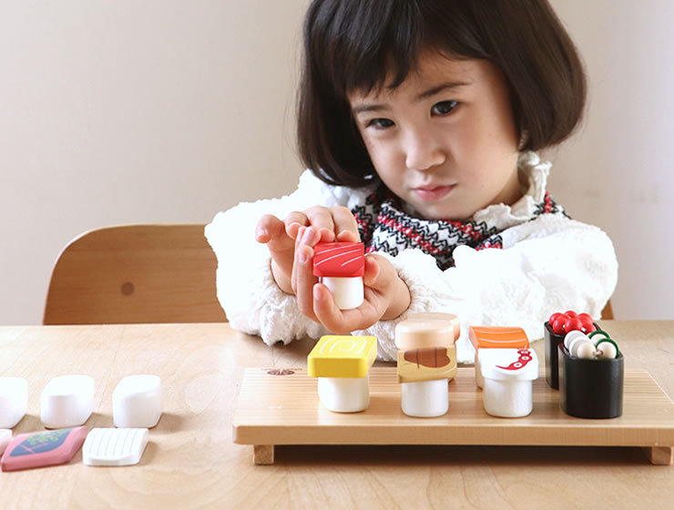 お品書きから好きなお寿司を選んで、握って、巻いて、盛り付けて楽しく遊べるおままごとセット。まぐろ・たまご・えびなどお馴染みのネタから、こちらの特上おすしセットは、湯呑や醤油さしなどの道具まで揃っています。