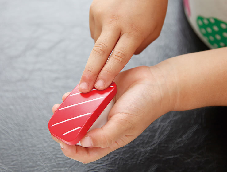 天然木の中に磁石を埋め込み、繰り返し切ったりくっつけたりできて、長持ちします。力を入れずに簡単に外すことができ、ネタとシャリがくっつくので、お子さまもストレスなく遊ぶことができます。また、面ファスナーと違い、断面にゴミやホコリが付きにくく衛生的で安心です。汚れた時のお手入れも簡単♪