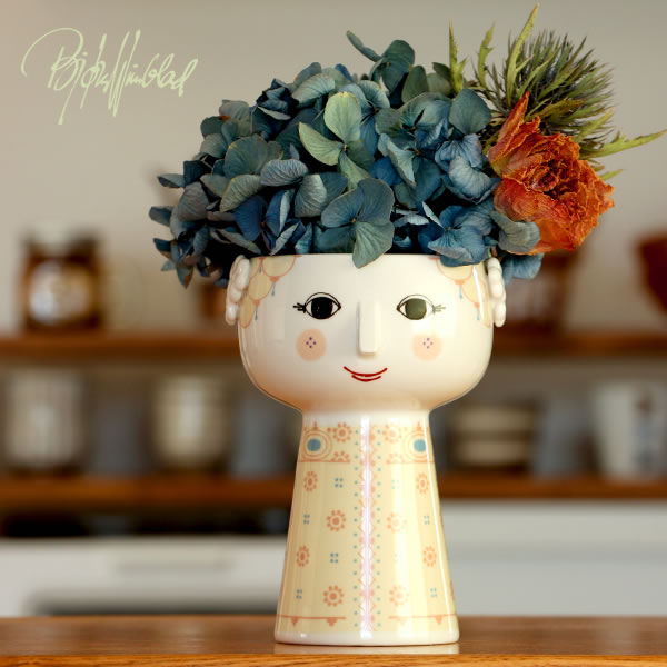 ビヨン・ヴィンブラッドの作品には強い女性像と花のモチーフが多く見られます。アーモンド型の目や三角の鼻を持つ女性の顔は彼のアイコニックな作品の一つで、それらをもとに作られたデコレーションアイテムは日常にアクセントを与えてくれます。