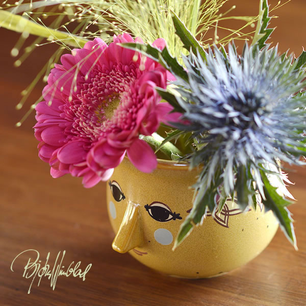 ビヨン・ヴィンブラッドの作品には強い女性像と花のモチーフが多く見られます。アーモンド型の目や三角の鼻を持つ女性の顔は彼のアイコニックな作品の一つで、日常にアクセントを与えてくれます。