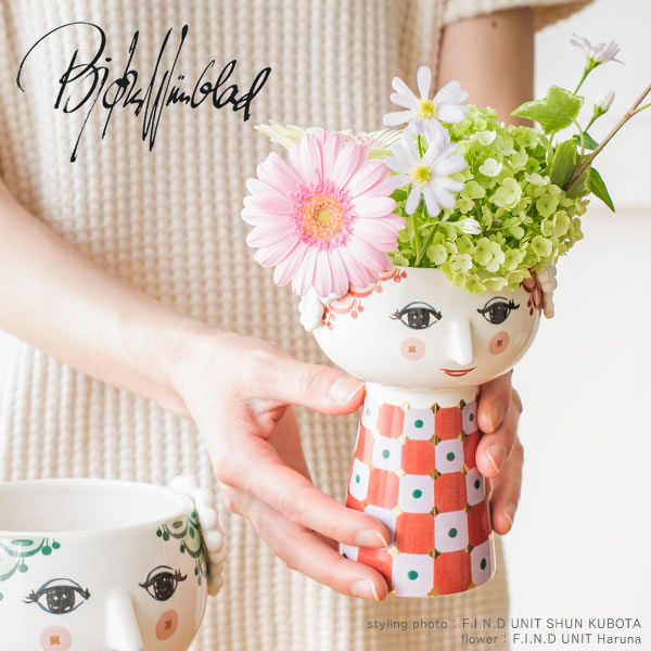 ビヨン・ヴィンブラッドの作品には強い女性像と花のモチーフが多く見られます。アーモンド型の目や三角の鼻を持つ女性の顔は彼のアイコニックな作品の一つで、日常にアクセントを与えてくれます。